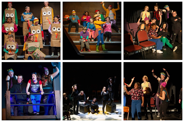 Anders was in his first college play and it was so good! He made a great punk rocker, a kindergarten turkey and a dramatic teen.   He was in the ensemble along with seven others.  They would interrupt the "story" being told by  the four main characters, with a reenactment of a true Thanksgiving performance put on by some school somewhere in the country.  The juxtaposition of these little snippets and the drama taking center stage was interesting and poignant.  I wasn't allowed to take video or photographs, but was able to get these from a professional photographer credited below.